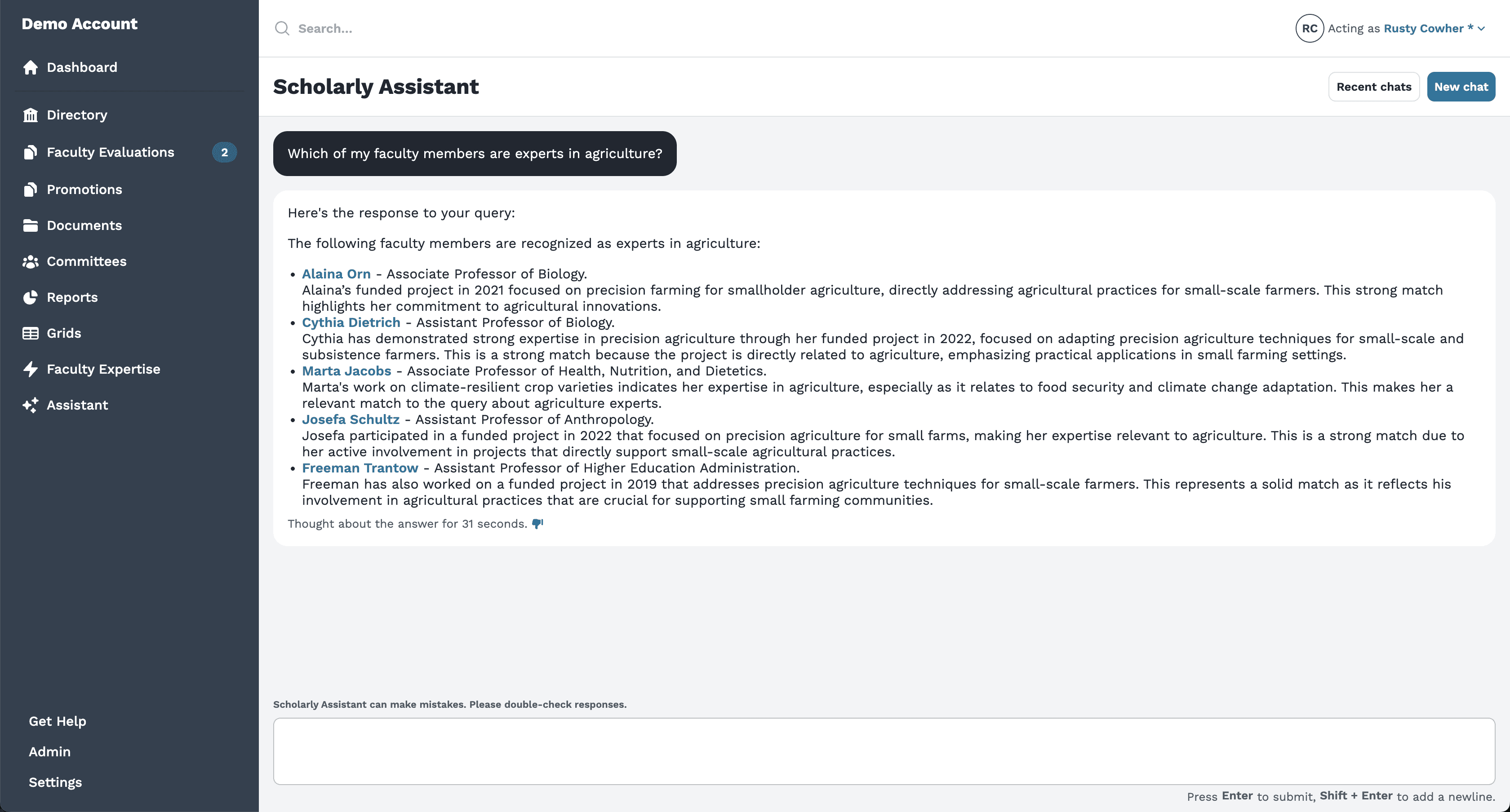 Scholarly Assistant is a conversational partner that keeps you in command: ask in natural language and get permission‑aware answers, summaries and visuals from your institutional data in seconds Every response shows its sources and context so you can validate, refine, and approve analysis before you share or export anything.